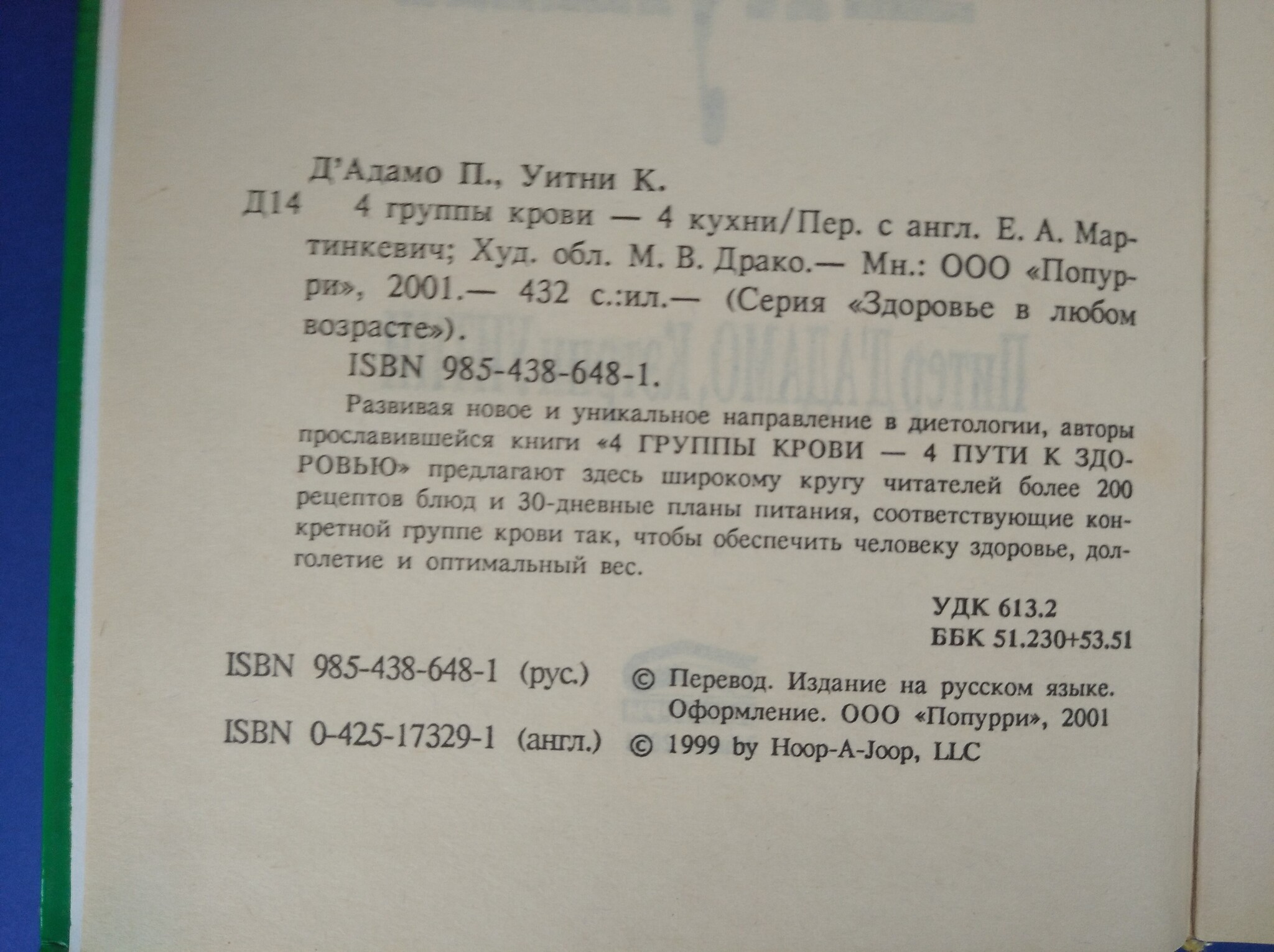 Развивая новое и уникальное направление в диетологии, авторы прославившейся книги `4 группы крови — 4 пути к здоровью` предлагают здесь широкому кругу читателей более 200 рецептов блюд и 30-ти дневные планы питания, соответствующие конкретной группе кровитак, чтобы обеспечить человеку здоровье, долголетие и оптимальный вес.
