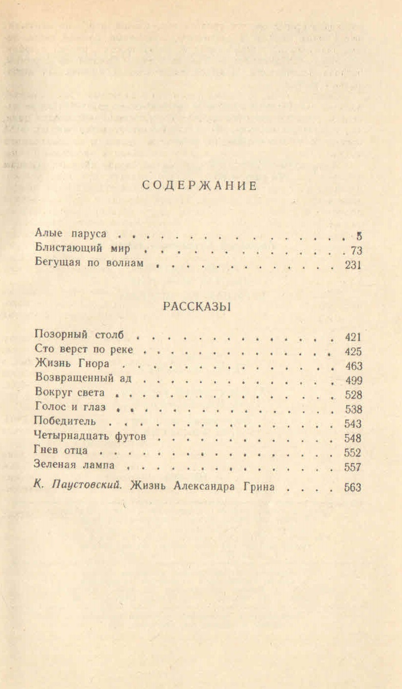 В сборник включены произведения русского советского писателя Александра Степановича Грина: "Алые паруса", "Блистающий мир", "Бегущая по волнам" и некоторые рассказы.