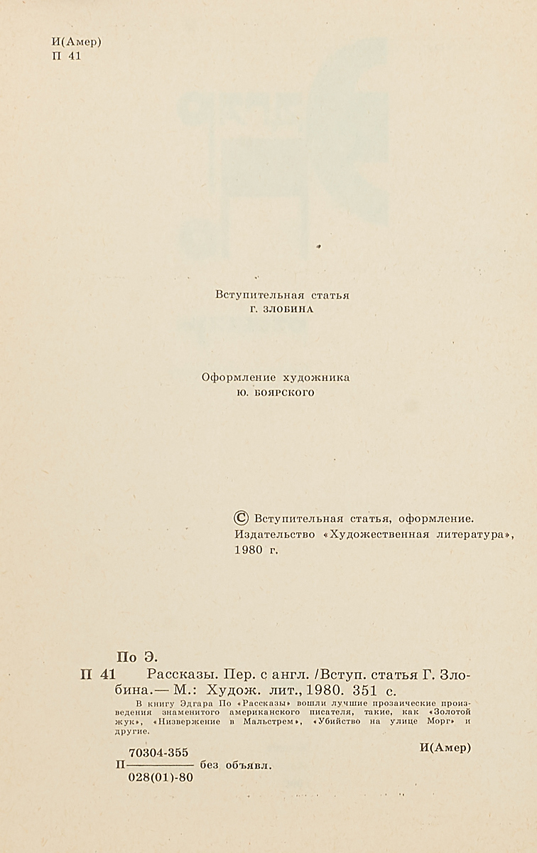В книгу вошли лучшие прозаические произведения американского писателя, такие, как "Золотой жук", "Низвержение с Мальстрем", "Убийство на улице Морг" и другие