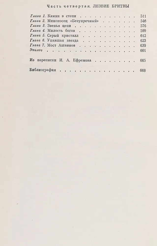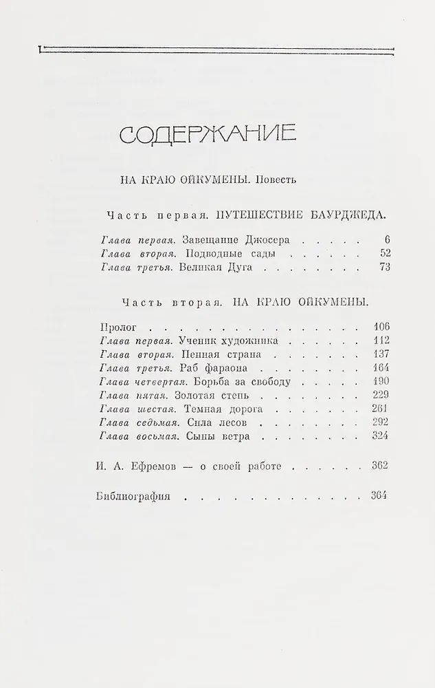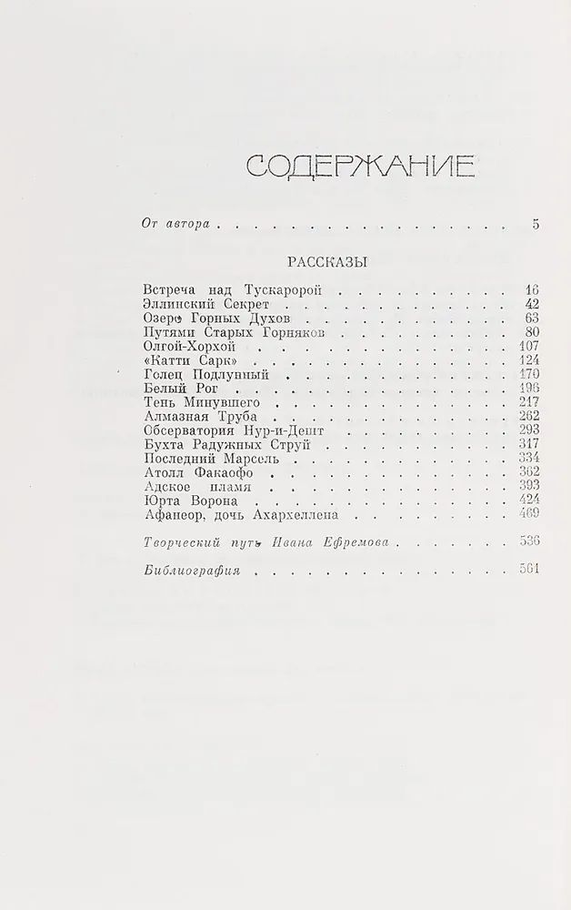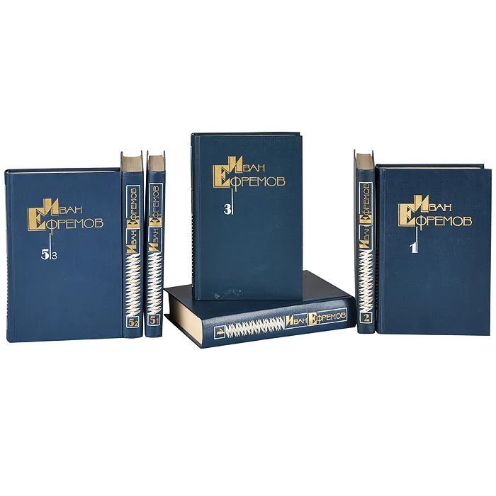 В пятитомное собрание сочинений классика отечественной фантастики Ивана Антоновича Ефремова, изданное в 1986-1989 годах, вошли практически все законченные художественные произведения автора. Фактически собрание сочинений состоит из семи книг, так как издательство к удовольствию читателей изменило планы (первоначально к изданию не планировался роман «Час Быка»), и пятый том вышел в трёх книгах. Тома с чёрно-белыми иллюстрациями художников. Во всех томах имеется дополнительный материал – авторские предисловия, статьи, письма, отрывки из интервью писателя. В конце каждого тома приведена библиография произведений, размещённых в томе.Содержание:В первый том вошли рассказы разных лет. Писатель обращается к непонятным и загадочным явлениям природы, показывает характеры мужественных, деятельных людей. В том вошли рассказы: "Встреча над Тускаророй", "Озеро Горных духов", "Юрта Ворона" и др.;Во второй том вошла книга "Дорога Ветров (Гобийские заметки)";В третий том вошли: роман "Туманность Андромеды", повести "Звездные корабли", "Сердце змеи" и рассказ "Пять картин";В четвертый том собрания сочинений вошел приключенческий роман "Лезвие бритвы", который ставит проблемы изучения возможностей человека, резервов психики, использования знаний, добытых тысячелетней практикой разных наук, в частности хатха-йогой.Том 5, книга 1. повесть "На краю Ойкумены";Том 5, книга 2. Научно-фантастический роман "Час быка". Действие романа развертывается на отдаленной от Земли планете Торманс, где господствуют угнетение и тирания олигархического строя;Том 5, книга 3. Исторический роман "Таис Афинская", а также ранее не издававшиеся: письмо Дмитриевскому В.И. и статья "Библиотека будущего". Роман показывает время Александра Македонского, уделяя много внимания учениям греческих философов, ставит сложные нравственные проблемы. Главная героиня романа Таис Афинская, участница походов Александра Македонского, - подлинная историческая личность.