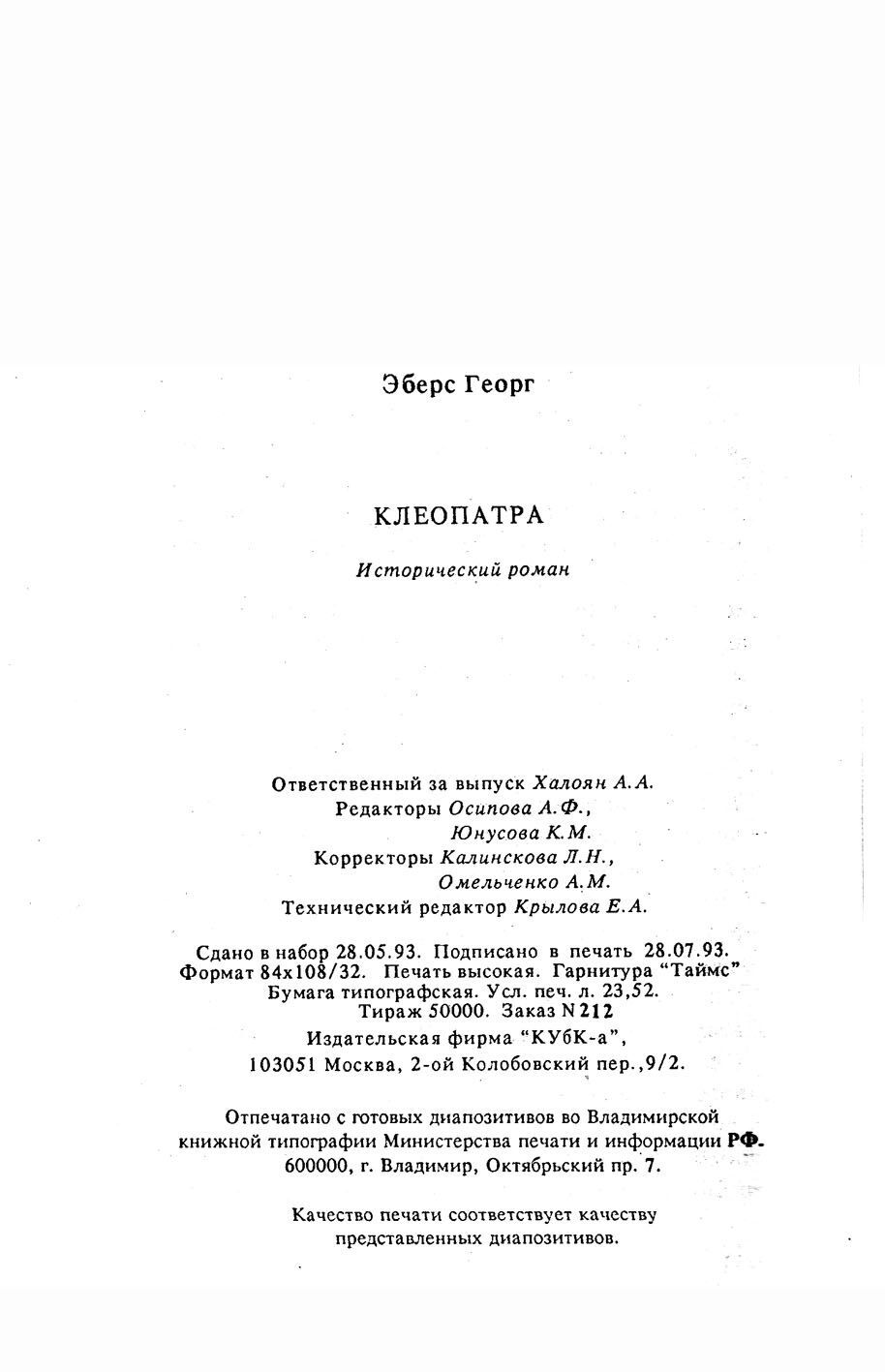 Личность Клеопатры окружена романтическим, почти сказочным ореолом. Даже злейшие враги восхищались ее красотой, а вот характер царицы, напротив, до сих пор являет собой труднейшую психологическую загадку. Легенды о темной стороне личности Клеопатры связаны с тем, что многие римляне не могли простить могущества женщине из покоренной страны, заставившей склонить голову самого Цезаря и превратившей великого полководца Марка Антония в своего слугу.На основании множества сохранившихся источников знаменитый немецкий писатель Георг Эберс создал интереснейший образ последней царицы Египта, которому можно верить, - чарующий образ женщины, не способной на низость ни при каких обстоятельствах.