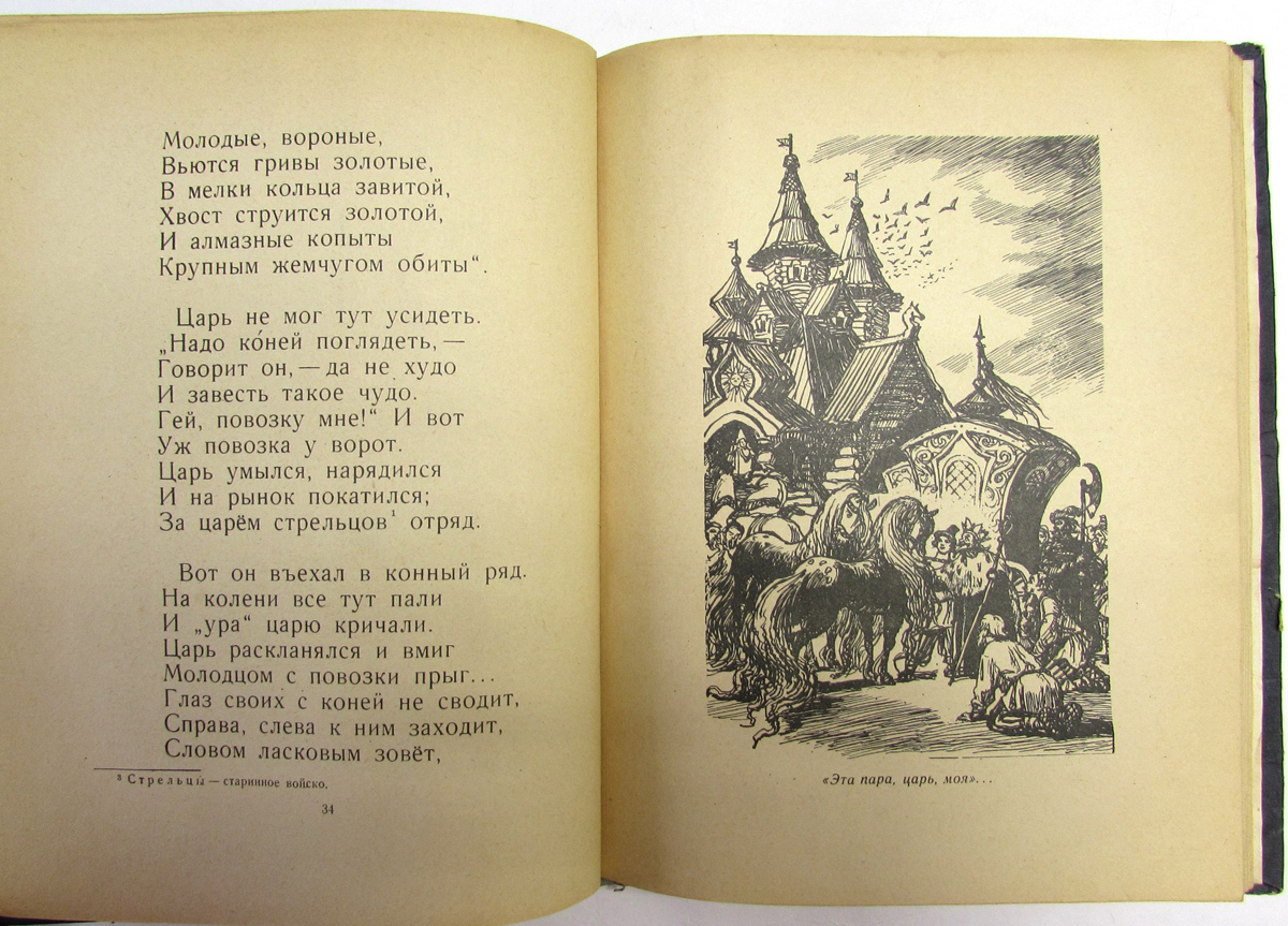 Известность Петру Павловичу Ершову (22 февраля (6 марта) 1815, Безруково, Ишимский уезд, Тобольская губерния - 18 (30) августа 1869, Тобольск) принесла его сказка «Конек-горбунок», написанная им еще на студенческой скамье и впервые напечатанная отрывком в 3 томе «Библиотеки для Чтения» 1834 года, с похвальным отзывом Сенковского. Первые четыре стиха сказки набросал Пушкин, читавший ее еще в рукописи. Сказка вышла отдельной книжкой в 1834 и выдержала при жизни автора семь изданий, причем второе издание 1856 - было сильно переработано автором и является на сегодня каноническим текстом. «Конек-горбунок» - произведение народное, почти слово в слово, по сообщению самого автора, взятое из уст рассказчиков, от которых он его слышал; Ершов только привел его в более стройный вид и местами дополнил. Своеобразный слог, народный юмор, удачные и художественные картины (конный рынок, земский суд у рыб, городничий) доставили этой сказке широкое распространение. Белинский видел в сказке подделку, «написанную очень недурными стихами», но в которой «есть русские слова, а нет русского духа». Существует версия, что сказка «Конек-горбунок» целиком написана Пушкиным и выпущена под именем Ершова. Рашид Файзрахманович Сайфуллин (Сайфулин) (1918-1947) - советский художник-график, иллюстратор, плакатист, г. Москва. Самоучка. Участник Великой Отечественной войны. Сотрудничал с издательством «Детгиз», газетой «Ударник Метростроя». Покончил с жизнью.