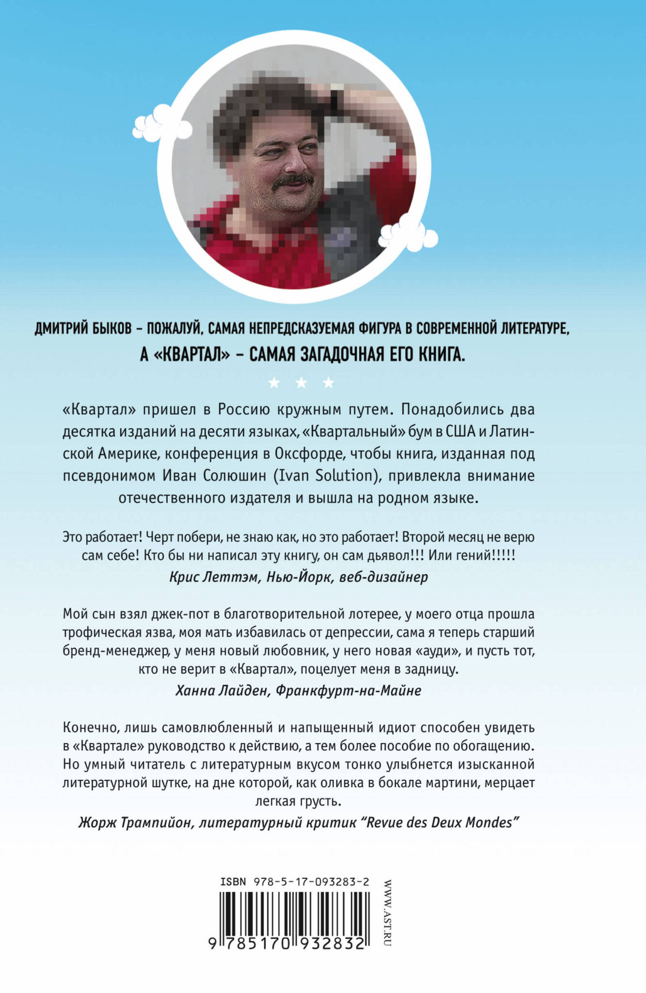 Новая книга Дмитрия Быкова – увлекательный квест, где главный герой – вы, читатель. При полном прохождении "Квартала" автор гарантирует богатство, независимость и счастливые личностные перемены. Действия, рекомендуемые "Кварталом", могут показаться абсурдными. Но они ничуть не абсурднее, чем кликанье мышью в компьютерной игре. И только от вас зависит, насколько убедительно выстроится сюжет.
