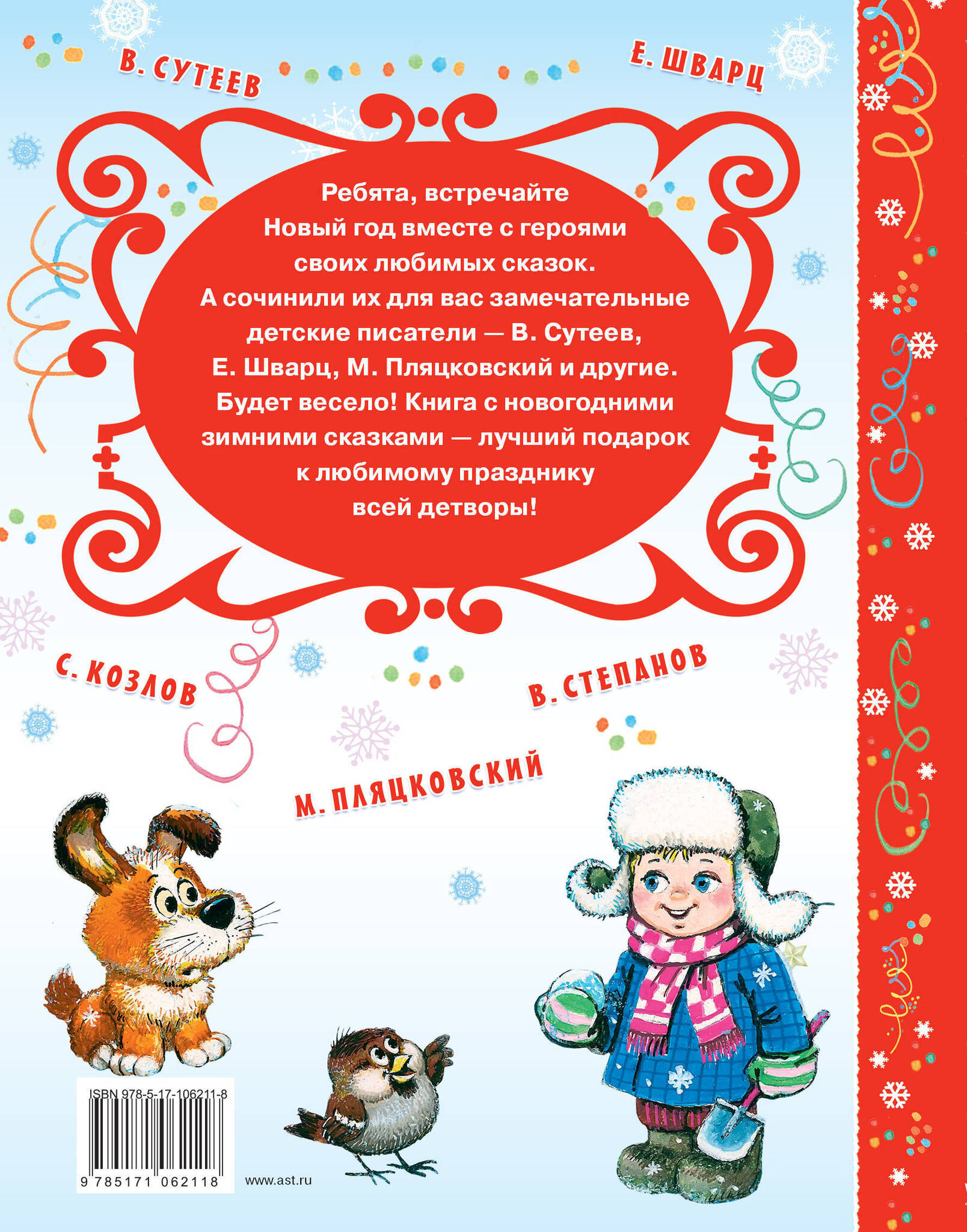 В книге собраны лучшие сказки про любимый праздник Новый год. Знаменитые сказки: В. Сутеева "Ёлка" - о новогодних приключениях Снеговика; сказка Е. Шварца "Два брата" - чудесная история о силе добра, о том, как важно ценить семью, любить родных, история, которая хорошо заканчивается под самый Новый год...