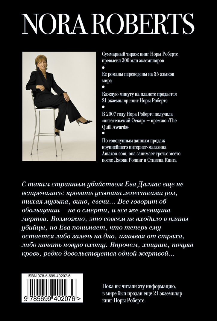 С таким странным убийством Ева Даллас еще не встречалась: кровать усыпана лепестками роз, тихая музыка, вино, свечи... Все говорит об обольщении - не о смерти, и все же женщина мертва. Возможно, это совсем не входило в планы убийцы, но Ева понимает, что теперь ему остается либо залечь на дно, либо начать новую охоту. Впрочем, хищник, почуяв кровь, редко довольствуется одной жертвой...
