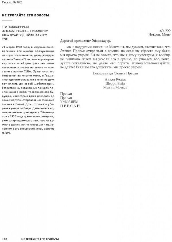 Среди писем - записка королевы Елизаветы II президенту Соединенных Штатов с личным рецептом шотландских оладий, трогательные письма Джона Стейнбека и Рональда Рейгана своим сыновьям о первой любви и семейной жизни, письмо Мика Джаггера Энди Уорхолу с описанием дизайна обложки альбома The Rolling Stones, последнее письмо Вирджинии Вульф мужу, написанное ею перед самоубийством, прощальное письмо сыну от японского. камикадзе времен Второй мировой войны, письмо Федора Достоевского брату Михаилу перед ссылкой, невероятное письмо ученого Френсиса Крика, в котором он объясняет сыну только что открытую структуру ДНК.