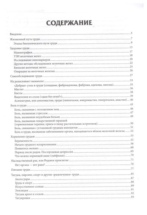 Вы не очень любите ходить по врачам, а слова «онкология», «уплотнение», «боль в груди» вызывают у вас страх, и вы не хотите про это думать? Значит, вы нормальный человек! Однако если продолжать бояться, то вы не сможете себе помочь. А если вы хотите побороть свой страх, тогда эта книга для вас. Она поможет вам разобраться в сигналах, которые посылает организм, и позаботиться о своем здоровье. Книга адресована тем, кто хочет понимать, зачем нужно обследовать грудь, ходить к маммологу и что ожидать от приема у врача; как по возможности избежать операции и как с помощью питания и образа жизни защитить себя от онкологических заболеваний. Вы узнаете про самообследование груди, про различные операции, в том числе и пластические; про боль в груди и последствия травм; о том, может ли наследоваться рак груди; как снизить вероятность появления новообразований.
