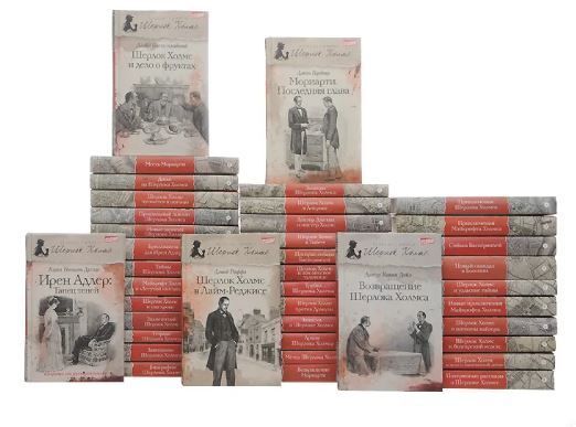 1)Артур Конан Дойл.Знаменитый Шерлок Холмс(включая неизвестное дело) 2)Артур Конан Дойл.Приключения Шерлока Холмса 3)Артур Конан Дойл.Записки о Шерлоке Холмсе(включая неизвестное эссе) 4)Артур Конан Дойл.Возвращение Шерлока Холмса 5)Артур Конан Дойл.Собака Баскервилей(включая "Долину страха") 6)Прощальный поклон Шерлока Холмса(включая редкие рассказы) 7)Артур Конан Дойл.Архив Шерлока Холмса(включая неизвестные рассказы о Холмсе) 8)Боб Гарсиа.Завещание Шерлока Холмса 9)Дэвид Стюарт Дэвис.Шерлок Холмс против Дракулы.(Включая "Дело о папирусе") 10)Шерлок Холмс в Америке ("Седьмая пуля" в серии только для СПб, включает неизвестные рассказы) 11)Лорен Эстелман.Доктор Джекил и мистер Холмс. (включая неизвестные рассказы) 12)Ричард Бойер.Призрак собаки Баскервилей. 13)Ричард Бойер.Шерлок Холмс и шпионы Кайзера 14)Нэльсон Дуглас.Бриллианты для Ирен Адлер (впервые на русском языке, первый роман из восьми в серии) 15)Джун Томсон.Тетради Шерлока Холмса 16)Куинн Фосетт.Приключения Майкрофта Холмса. (первый роман из четырех) 17)Джун Томсон.Тайны Шерлока Холмса 18)Джун Томсон.Трубка Шерлока Холмса.(Впервые на русском языке) 19) Кэрол Нельсон Дуглас. Ирен Адлер - танец теней (впервые на русском языке, восьмой роман из восьми в серии) 20) Джерард Келли. Потерянные рассказы о Шерлоке Холмсе 21) Куинн Фосетт. Новые приключения Майкрофта Холмса (впервые на русском языке, четвертый роман из четырех в серии) 22) Джун Томсон. Метод Шерлока Холмса (впервые на русском языке) 23) Джамьянг Норбу. Шерлок Холмс в Тибете 24) Ллойд Биггл-младший. Шерлок Холмс и уэльские тайны 25) Куинн Фосетт. Майкрофт Холмс и "Летучий шотландец" (впервые на русском языке. третий роман из четырех в серии) 26) Ллойд Биггл-младший. Шерлок Холмс и дело о фруктах 27) Джун Томсон. Досье на Шерлока Холмса (впервые на русском языке) 28) Фред Саберхаген. Шерлок Холмс и узы крови 29) Джон Гарднер "Возвращение Мориарти" / John Gardner "The Return of Moriarty" 30) Гарднер Джон - Месть Мориарти 31) Гарднер Джон "Мориарти. Последняя глава" / John Gardner "Moriarty" тираж 18745 экз. 303 стр. 32) Кэрол Нельсон Дуглас "Новый скандал в Богемии" / Carole Nelson Douglas @Another Scandal in Bohemia" тираж 18145 экз. 510 стр. 33) Дэвид Раффл "Шерлок Холмс в Лайм-Реджисе" / David Ruffle "Sherlock Holmes and The Lyme Regis Legacy" тираж 17645 экз. 318 стр. 34) Дэвид Маркум " Записки Шерлока Холмса" тираж 17045. 254 стр. 35) Чарли Роксборо - "Шерлок Холмс и дело о шахматной доске" /David Wilson "Sherlock Holmes and The Case of the Edinburgh Haunting" Charlie Roxburgh "The Case of the Russian Chessboard" тираж 16545 экз. 318 стр. впервые на русском языке. 36) Мэтью Джеймс Эллиот "Шерлок Холмс пускается в погоню" 37) Дэвид Маркум " Новые записки Шерлока Холмса"(The Paper of Sherlock Holmes. Volume 2), авторский сборник, первое издание 38) Тим Саймондс "Шерлок Холмс и болгарский кодекс" 39) Дэвид Раффл "Шерлок Холмс и лох-несское чудовище" 40) Ник Реннисон "Биография Шерлока Холмс