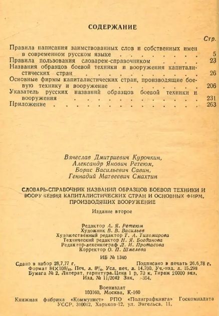 Настоящий словарь-справочник представляет собой первую попытку дать единый вариант передачи на русском языке названий образцов вооружения и боевой техники капиталистических государств и устранить тем самым существующий разнобой в написании этих названий. В словарь включены наиболее часто встречающиеся , названия ракет, космическиу летательных аппаратов,самолетов, вертолетов, образцов автобронетанковой и инженерной техники, стрелкового оружия и электронного оборудования капиталистических государств. Во избежание дублирования справочников по корабельному составу иностранных флотов названия боевых кораблей в словарь не включены. Наряду с названиями образцов вооружения и боевой техники, используемых в армиях капиталистических государств в настоящее время, в словарь помещены также названия некоторых устаревших, снятых с вооружения образцов, относящихся к годам второй мировой войны (1939—1945 гг.) и к послевоенному периоду, поскольку эти названия встречаются в военно-истерической и военно-технической литературе. В словаре помещен также перечень названий основных фирм капиталистических стран, производяших во- оружете и боевую технику, при передаче которых на РУсском языхе существуют различные варианты написания этих названий. Словарь рассчитан на лиц, работающих с иностранной военной и технической литературой и, в первую очередь, на переводчиков, работников издательств, редакций газет и журналов.