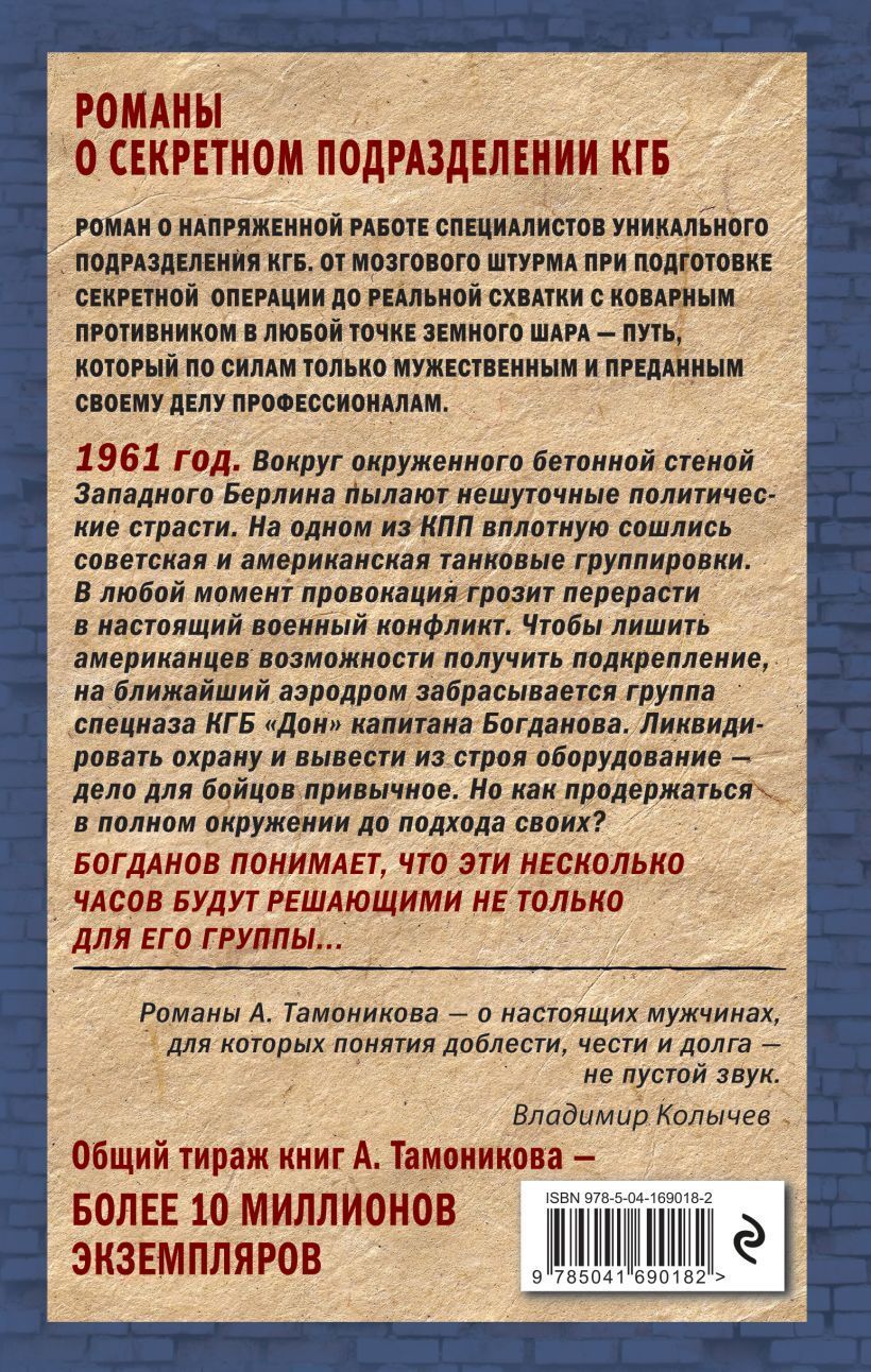 Роман о напряженной работе специалистов уникального подразделения КГБ. От мозгового штурма при подготовке секретной операции до реальной схватки с коварным противником в любой точке земного шара - путь, который по силам только мужественным и преданным своему делу профессионалам.1961 год. Вокруг окруженного бетонной стеной Западного Берлина пылают нешуточные политические страсти.
