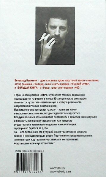 Всеволод Бенигсен - прозаик нового поколения, автор романов "ГЕНАЦИД" (лонг-лист премии "БОЛЬШАЯ КНИГА"), "Раяд" (шорт-лист премии "НОС"). Его проза всегда социально заострена и одновременно авантюрна.Содержание нового романа "ВИТЧ": Время - конец 90-х. Московский журналист Максим Терещенко, в "застойные годы" принимающий участие в неподцензурном альманахе "Глагол", получает заказ от таинственного издательства написать книгу о диссидентах 70-х, в частности, о тех, кто был выслан из страны - в один прекрасный день "творческую интеллигенцию" посадили на самолет, следующий в Мюнхен и …А вот дальше началось непонятное. Оказывается, никто из них так и не пересек государственную границу, очутившись вовсе даже не в Германии, а в закрытом городе (ЗАТО) "Привольск-218". Более того, по мере того, как герой проводит свое "журналистское расследование", выясняется, что после падения СССР жители ЗАТО не только не выразили желания покинуть место своего вынужденного пребывания, но и отказываются пускать туда "чужих"…Максим пытается прорваться в эту "резервацию интеллигентов" в компании с инициатором данного "издательского проекта" - неким Зонцем, обаятельным негодяем, мотивы которого герой узнает лишь в самом конце романа…Литературные параллели на уровне снижения метафор здесь налицо: "Телемская обитель", "Игра в бисер". Но это и остросовременный роман, в котором яркая сатира соседствует с не менее острой рефлексией.